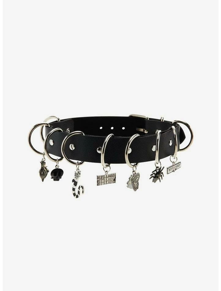 Say his name three times and a new choker will materialized! This faux leather one features silver-tone D-rings with dangling Beetlejuice-themed charms.ย ย