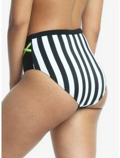 ย Be the (beach) Ghost with the Most! These swim bottoms inspired byย Beetlejuiceย have black & white stripes with lime green strappy detailing at the hip, over mesh panels. Pair with the matching top to complete your beach day look!