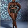 Β Be the (beach) Ghost with the Most! These swim bottoms inspired byΒ BeetlejuiceΒ have black & white stripes with lime green strappy detailing at the hip, over mesh panels. Pair with the matching top to complete your beach day look!