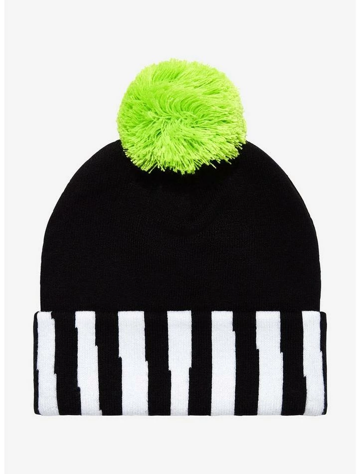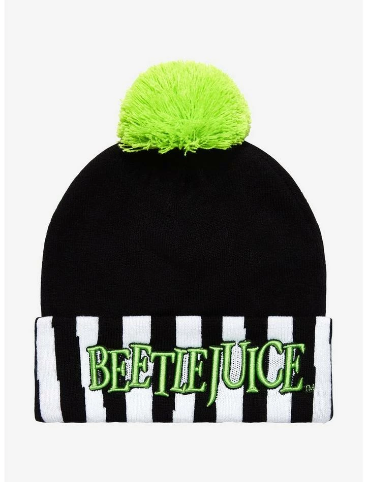 Beetlejuice may be a questionable bio-exorcist, but he sure knows how to keep your head warm! Rock a look inspired by the Ghost with the Most with this beanie! Featuring a black and white striped cuff with “Beetlejuice” embroidered across, plus neon green pom detailing up top.