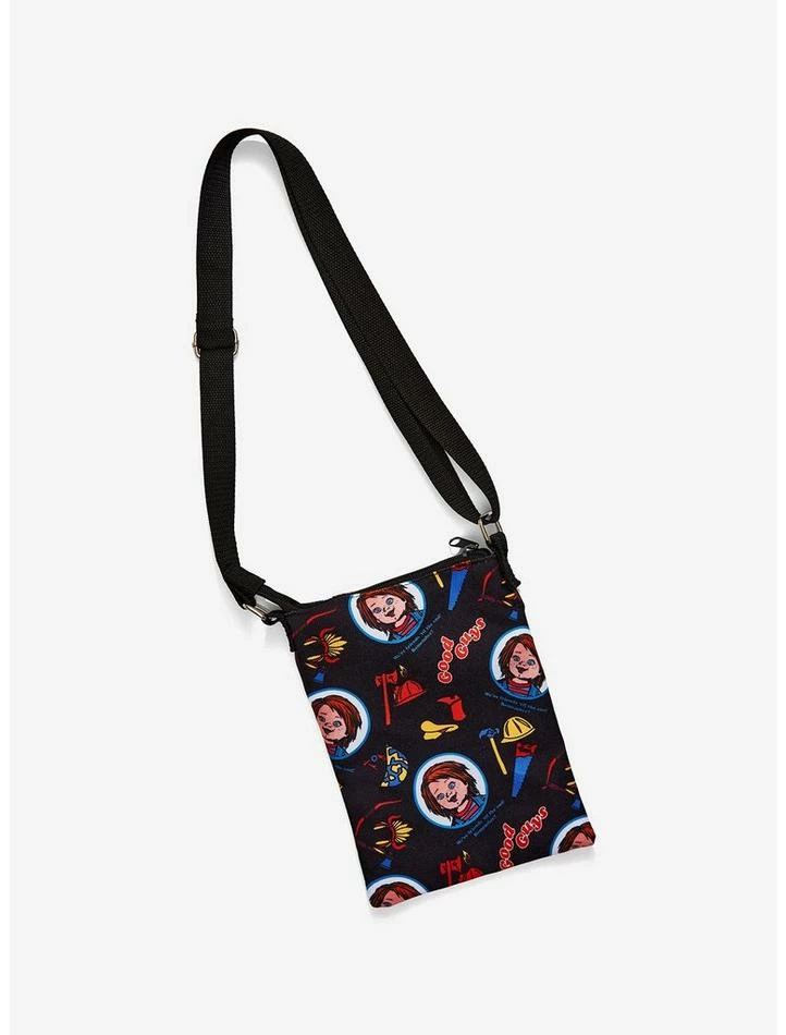Bring all of your essentials with you on your next playdate with Chucky in this Child’s Play passport crossbody bag! Featuring a toss print of Chucky, the Good Guys logo, doll accessories and more! Comes with an adjustable crossbody strap, front zipper pocket and top zipper closure.