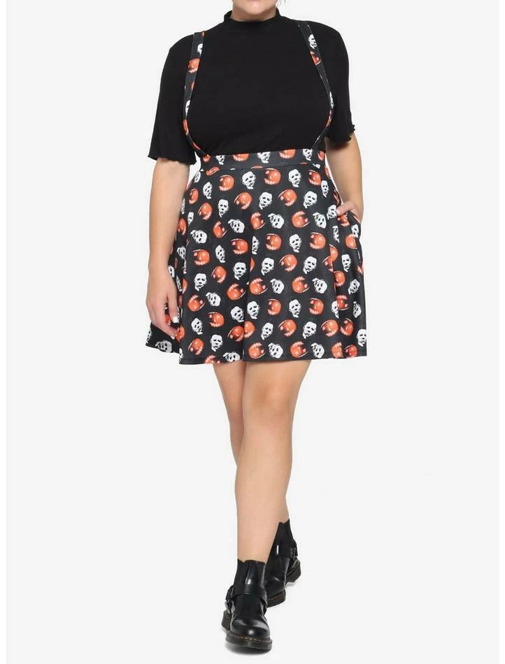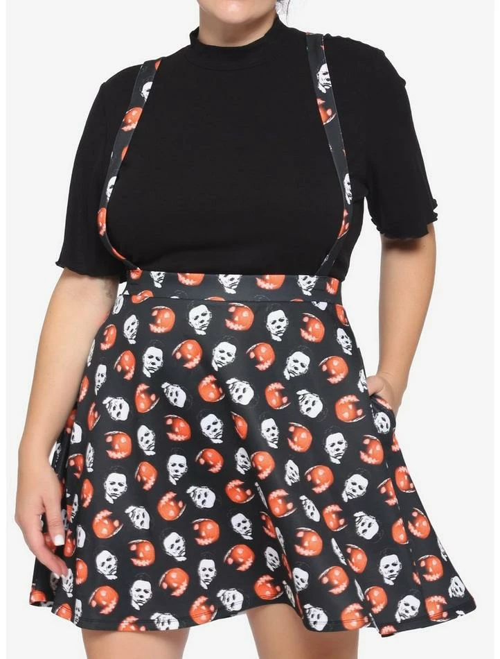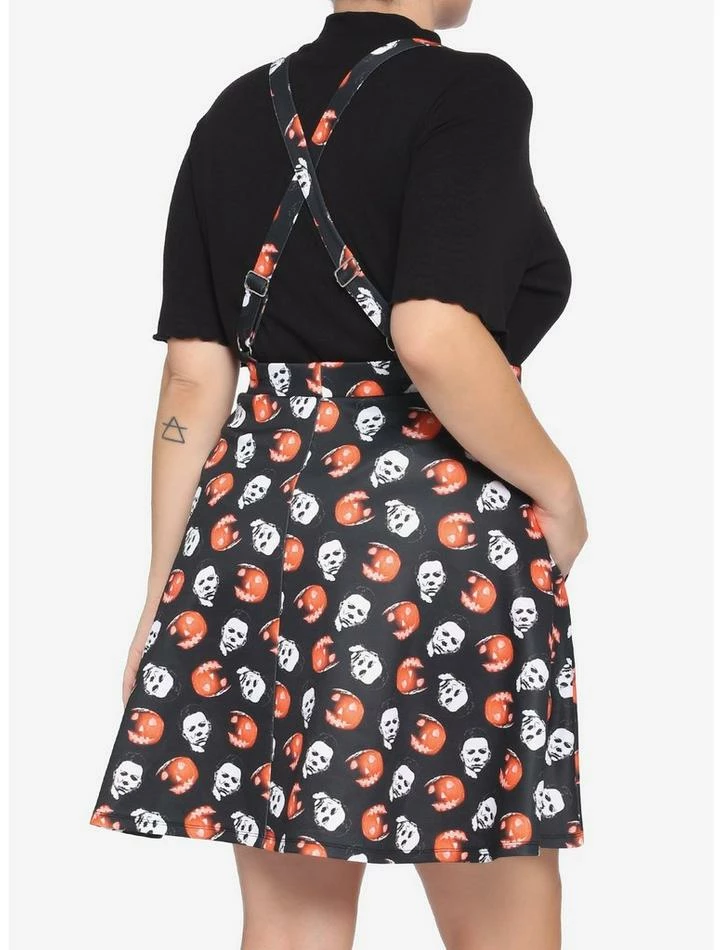 While Michael Myers is busy carving up teens, might we recommend some pumpkin carving instead? From Halloween, this suspender skirt features an allover pattern of pumpkins and images of Michael Myers’ face as well as crossover suspender straps.