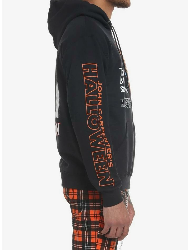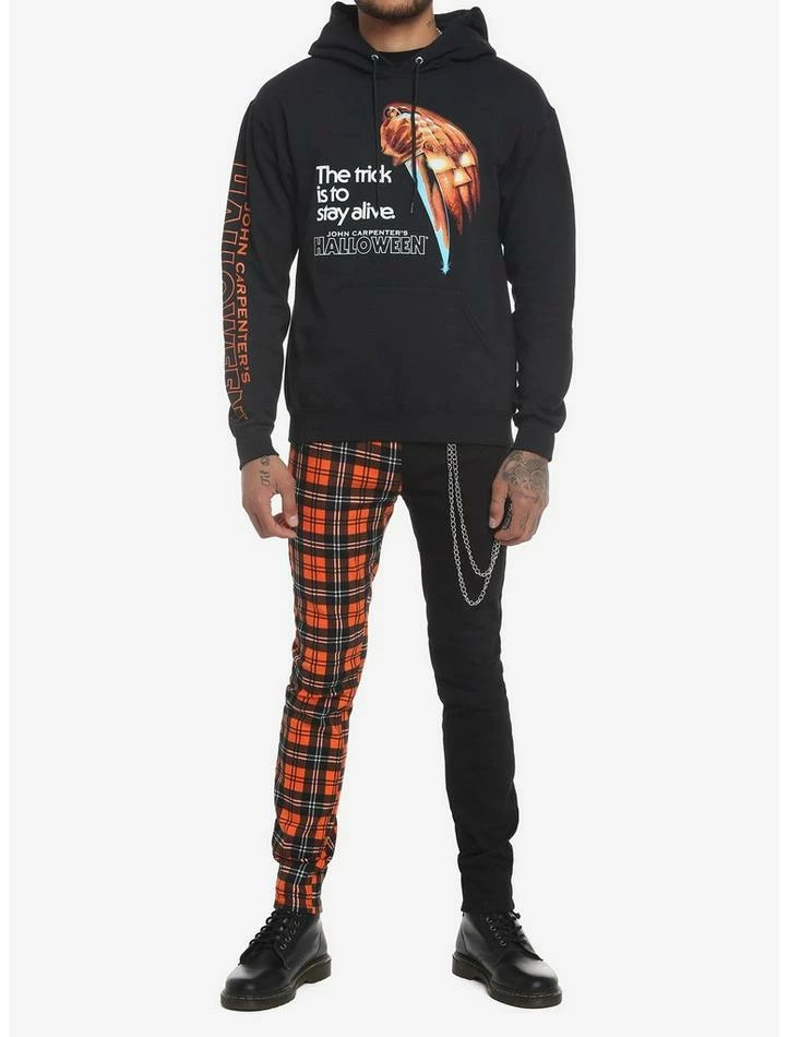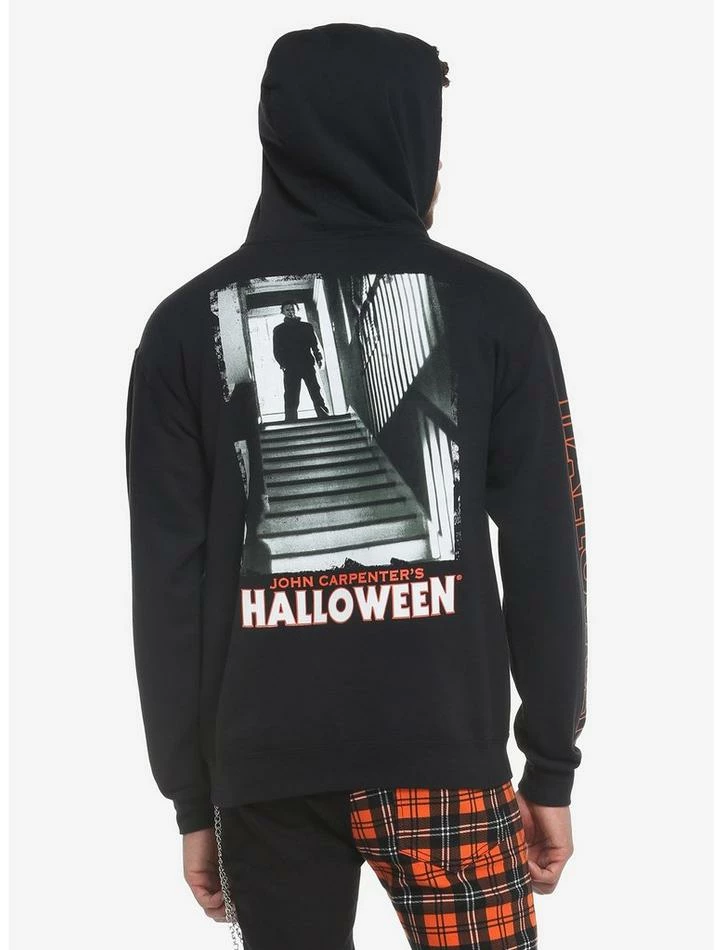 Make sure you stay alive and cozy with this hoodie on! Add something killer to your wardrobe with this Halloweenย hoodie, featuring a poster print of Michael Myers on the back in black & white, with the movie title underneath, printed down one sleeve and on the front. “The trick is to stay alive” is on the front with a chilling graphic.ย