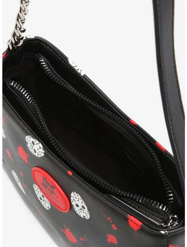 Getting ready for a late night rendezvous at Camp Crystal Lake? Complete your killer outfit with the perfect accessory! From Friday the 13th, this baguette bag features an allover print of Jason’s mask and blood splatter. Comes with an interior drop pocket, a half chain strap and top zipper closure.ย