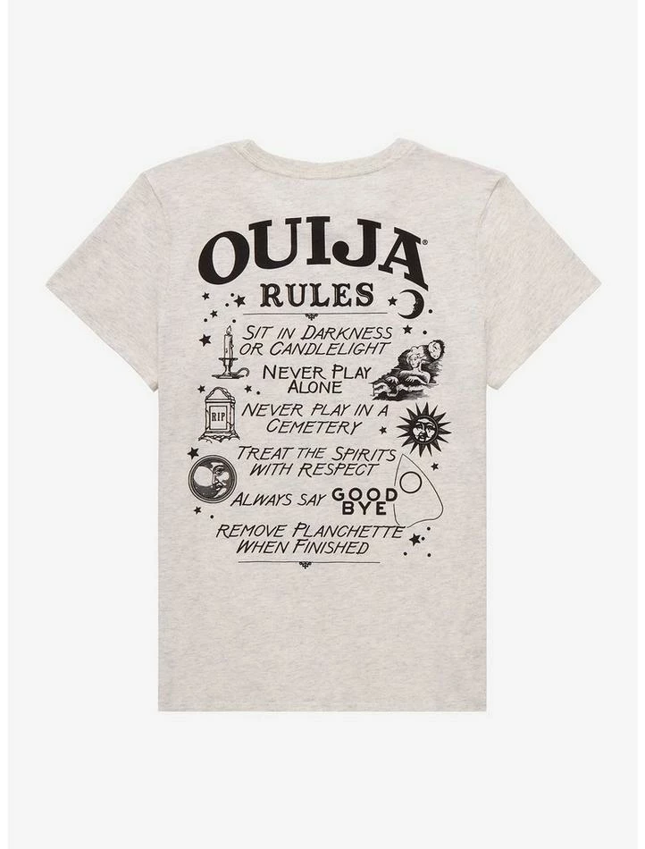Ever wonder how to connect with spirits? This oatmeal Ouija tee will show you how! Featuring a Ouija planchette on the front and list of rules and corresponding artwork on the back.
