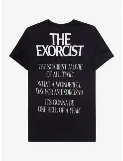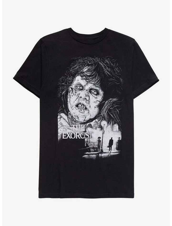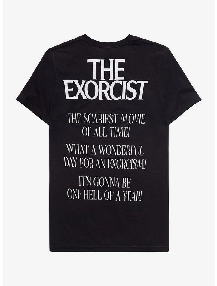 The power of this shirt compels you! This black tee features a large graphic of Regan and the iconic scene of Father Merrin’s arrival on the front and The Exorcist logo and reviews of the film on the back.Β