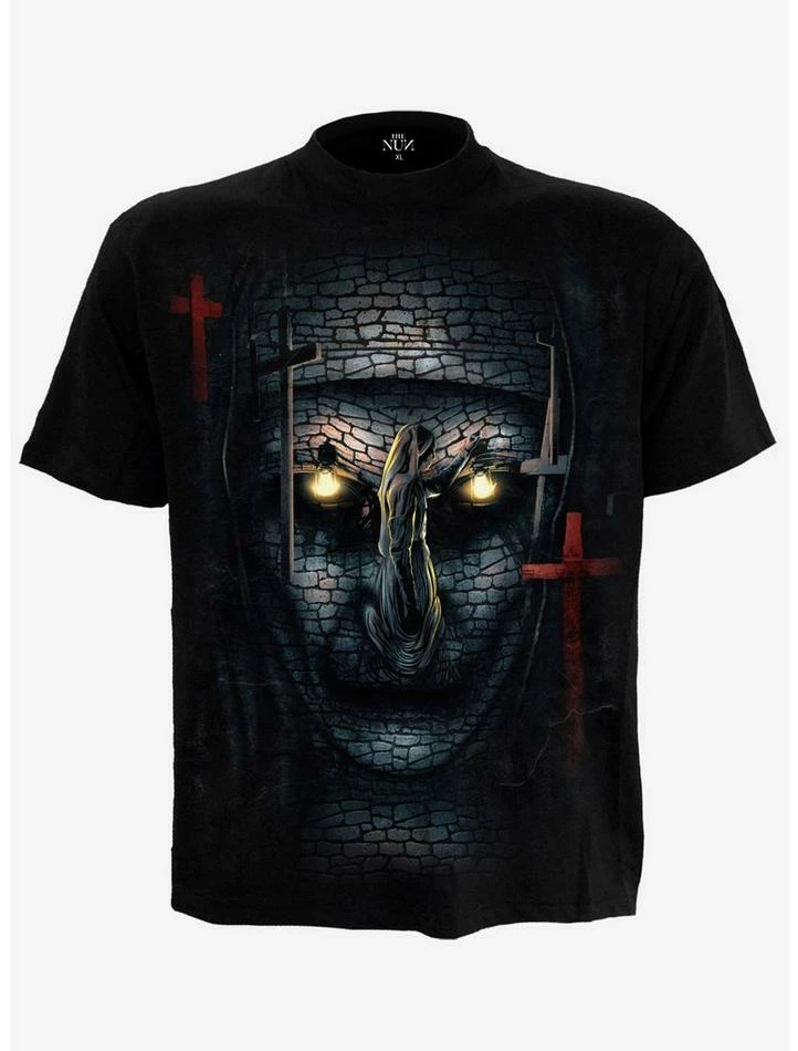Two flickering lamps pierce through the surrounding gloom in the cellar of the convent, their light forming the eyes of Valak, with the walls around creating her terrifying face. This T-Shirt is made of top quality cotton jersey using skin friendly, Azo-free, reactive dyes.