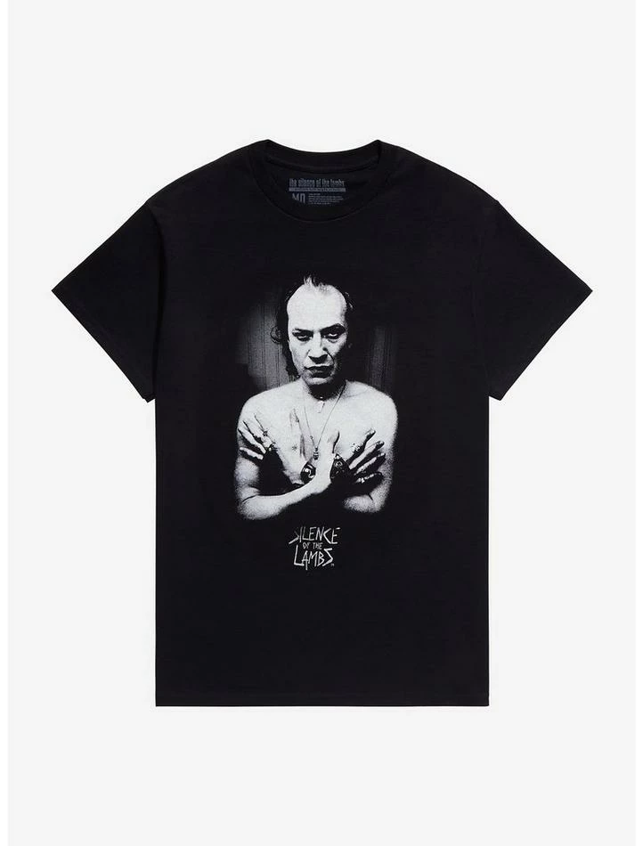 Rep your favorite serial killer with this The Silence of the Lambs tee! Featuring a black and white image of Buffalo Bill with his arms crossed across his chest.