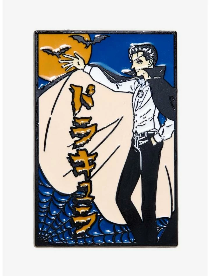 Looking for something spooktacular to add to your Universal Monsters collection? Take a bite outta this enamel pin! This poster-inspired design features an anime-inspired illustration of Dracula, and has the Dracula title in Japanese below.