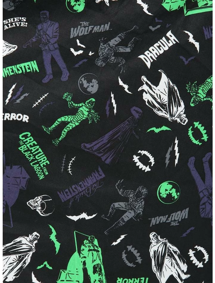 Are you a sucker for the classics? So are we! This dress is just for you it features a purple, white and green print of images from a series of classic horror flicks, green trim and back zipper closure.